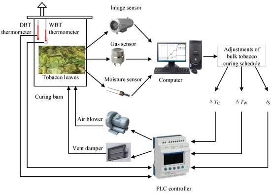 A gas sensor, image sensor, and moisture sensor were employed to observe the curing condition of the tobacco leaves. The framework of the proposed intelligent control method for the tobacco curing schedule is shown in Figure 1. Three types of sensor data were collected, and all were sent to a computer to process and analyze. After computer processing the multi-sensor data and deciding how to adjust the bulk curing schedule, the adjustment decision was sent to the programmable logic controller (PLC), which received this order and controlled the air blower and vent damper in order to make sure the measured DBT and WBT of the curing barn would just follow this modified curing schedule.