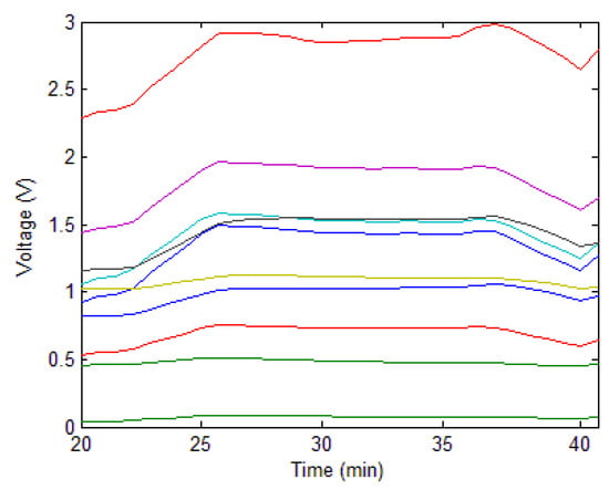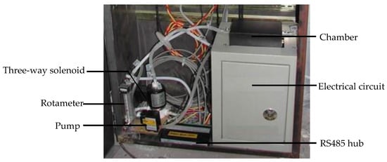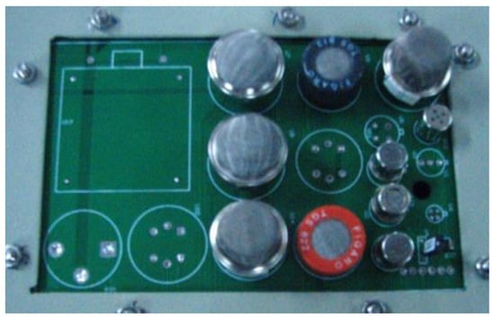 The E-nose prototype (Figure 2) developed in this study was placed outside of the curing barn. The volume of the chamber in the E-nose is approximately 230 mL, and the sensors array (Figure 3) was located inside of the chamber. The inlet of the chamber was connected to one port of the three-way solenoid valves, which featured three port connections and two valve orifices, while the other two ports of the three-way solenoid valves were separately connected to the gas from the bulk curing barn and the ambient air that was purified by an air filter. The outlet of the chamber was connected to the pump. In the present study, the entire odor sampling period was one hour. In the first 15 min, a pump evacuated air from the chamber, and the valve of the pure air side was switched on. During this time, pure air entered the chamber from its inlet, and the gas sensors were expected to have no response. In the next 10 min, the valve of the pure air side switched off while the valve of the sampling gas turned on. The air in the bulk curing barn was evacuated into the chamber, and the gas sensors started to make responses to the volatile organic compounds (VOCs) released by the tobacco leaves during this period. After that, the sampling gas was blocked, and pure air was evacuated into the chamber again so as to purge the air in the chamber and to fully clean it. This process lasted another 15 min. In the rest of the time during the sampling period, the pump was switched off. The response curves of the gas sensors in one odor sampling period, also known as the original response curves, were similar to the static response curves []. When the pump was working, it evacuated gas from inside the chamber at the flow rate of 3 L/min. To maintain a relatively stable gas flux, a rotameter was installed between the pump and chamber. The on or off state of the pump, as well as the switching on or off of the three-way solenoid valves were controlled by the computer. The sensors array sent odor signals to the signal amplifier and regulation buffer. These analog signals then were converted to digital signals by a 12-bit ADC of the electrical circuit, at 3300 samples per second, and were sent to the computer. The computer processed the measured sensor signals, extracted the odor features, and analyzed them together with the other sensors’ data in order to achieve the intelligent control of the bulk tobacco curing schedule.