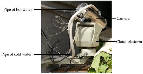 A machine vision system was developed in order to sense the image, specifically the color of the tobacco leaves during curing. The image sampling set-up is shown in Figure 4. A digital camera (CNB-ZCN-21Z22, CNB Technology Inc., Seoul, Korea) protected by a vacuum insulated shield (operating temperature range: −50~150 °C) with a cloud platform was fixed on the wall of the curing barns. The cloud platform made it possible to watch and monitor the tobacco leaves at any corner of the barns. Two water pipes were set around a camera and were used to cool down the camera, as a high temperature would be achieved during curing, which might affect the image quality of the camera. During the curing, images of the tobacco leaves were captured every hour, and were decoded by a video decoder card (DS4004HC, Hikvision Digital Technology Co., Ltd., Hangzhou, China) and sent to the computer, where the images were saved in bitmap format with the effective pixels number at 752 × 582. The image data were collected in such a way that the tobacco curing process could be protected and maintain its integrity.