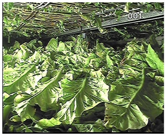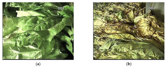 The tobacco drying process has a great influence on the quality of cigarette smoke [,]. The methods of tobacco drying are various all around the world, such as solar energy drying [], hot water drying [,], and the flue-curing method. In China, the flue-curing method is mostly applied, which incorporates airflow and temperature control in bulk curing barns []. Specifically, temperature control refers to keeping the dry-bulb temperature (DBT) and wet-bulb temperature (WBT) of the curing barn consistent with the bulk tobacco curing schedule, which is designed based on the three-stage curing theory. In this theory, according to the changes in the chemical and physical characteristics of tobacco leaves, the bulk tobacco curing process could be divided into three stages, namely: leaf-yellowing, leaf-drying, and stem-drying. During curing, the curer, who is a professional worker, observes the tobacco curing condition so as to adjust the bulk curing schedule in order to make sure the fragrant tobacco leaves be cured out.