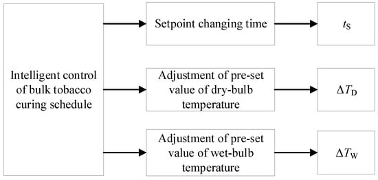 Analyzing the controlled parameters is the first step to model the intelligent control of a bulk tobacco curing schedule. The tobacco leaves were cured following a certain tobacco curing schedule. Before the curing began, a pre-set tobacco curing schedule was put in the memory of PLC. During the curing, the curing schedule could be adjusted by the curer as a result of the specific curing condition of the tobacco leaves. The intelligent control of the tobacco curing schedule means appropriately adjusting the controlled parameters of the curing schedule according to the information received from the multi-sensor data, which represent the image, odor, and moisture of the tobacco leaves. According to the curer’s operation of the curing schedule, the adjustment includes modifying the setpoint changing time (), which denotes the curing time when the curing process changes from the current phase to the next; the adjustment of the pre-set value of the DBT, designated as ; and the adjustment of the pre-set value of WBT, designated as . These controlled parameters are all shown in Figure 6.