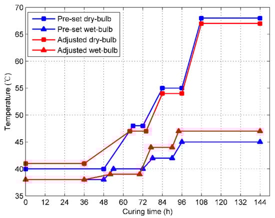 In order to give a detailed and clear description of the relationship between the controlled parameters and the tobacco curing schedule, an abridged general view of the tobacco curing schedule is plotted in Figure 7. The curing schedules in blue are the pre-set ones that are originally put in the memory of the PLC before curing, while the schedules in red are the adjusted ones that are made by the curer during curing. If the data is collected at the curing time of the 24th hour, the controlled parameters will be recorded as follows: is 36th hour, is 1 °C, and is 0 °C.