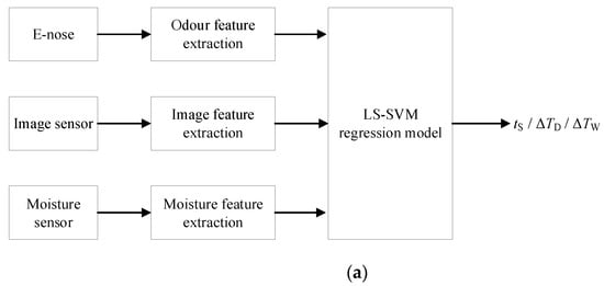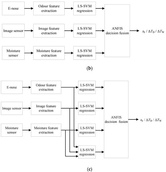 The hybrid fusion scheme (Figure 8c) incorporates feature level fusion into decision level fusion. Four local decisions are made by four LS-SVM regression models, the inputs of which are the image, odor, moisture, and joint features, individually, which are then put into the ANFIS model to predict the final controlled parameter.