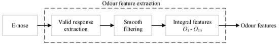 The odor features were extracted using the method presented in Figure 9. A valid response of the gas sensors should be extracted from the original response curves, as the noise and disturbance that appear when the sampling gas has not entered the chamber yet might impact the odor feature extraction. Then, after the smooth filtering of the valid response curves, this could be applied to extract the odor features. The methods of odor feature extraction that are normally used are based on the basic characteristics of the response curve [,,]. In this study, integrals at a specific interval from the response curves were extracted. Integrals may represent the accumulative total of the reaction degree changing, which also reflects the gas sensor response equilibrium final steady state information, which is also used to distinguish between the different types and concentrations of odor. The integral of the response curve is given as follows: