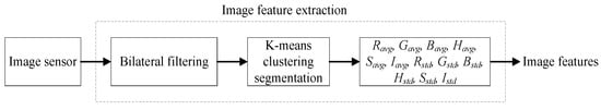 During curing, images of the tobacco leaves were taken using the camera fixed on the wall of the curing barn, and were sent to the computer to process. The image feature extraction method (Figure 10) involved bilateral filtering and K-means clustering segmentation. The algorithms were described detailed by Wu et al. []. In total, 12 image features were extracted, which were noted as Ravg, Gavg, Bavg, Havg, Savg, Iavg, Rstd, Gstd, Bstd, Hstd, Sstd, and Istd, where Ravg, Gavg, and Bavg are the mean values of the red component, the green component, and the blue component in the red, green, and blue (RGB) color model of the tobacco leaves image, respectively; Havg, Savg, and Iavg are the mean values of the hue component, the saturation component, and the brightness component in the hue, saturation, and intensity (HSI) color model of the tobacco leaves image, respectively; Rstd, Gstd, and Bstd are the standard deviation of the red component, the green component, and the blue component in the RGB color model of the tobacco leaves image, respectively; and Hstd, Sstd, and Istd are the standard deviation of the hue component, the saturation component, and the brightness component in the HSI color model of tobacco leaves image, respectively.