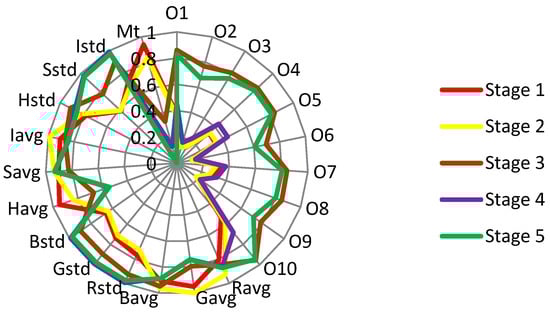 At the leaf-drying stage (stage 3), the odor features made the most significant change and became the strongest out of the whole curing, indicating that the fragrance and VOCs come out largely at this stage, which is a similar conclusion to Song et al. []. The image features at this period continued to make changes, and the color of the tobacco leaves curing at this stage tended to be fixed. The moisture feature decreased a lot, and the decreasing amplitude was much larger than that from stage 1 to stage 2.