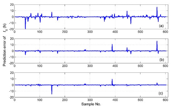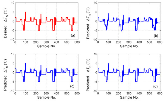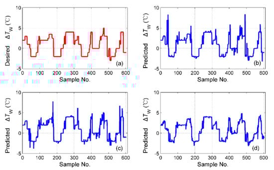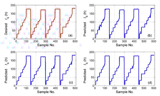 The simulation results of for the different fusion schemes are shown in Figure 16, and the corresponding prediction error is shown in Figure 17. It is obvious that the best performance of the prediction is the hybrid fusion model, for which the prediction results are shown in Figure 16d and Figure 17c. The feature level fusion scheme provides relatively poor predictions (Figure 16b and Figure 17a), in which the maximum error achieved 20 h, which is unacceptable for curing hours. The simulation results of are shown in Figure 18, and the prediction error is shown in Figure 19. The prediction results of the feature level fusion (Figure 18b) do not agree with the desired results (Figure 18a). The simulation results of the decision level fusion and hybrid fusion are quite similar. The simulation results of are shown in Figure 20, and the prediction error is shown in Figure 21. Both of the results made by the feature level (Figure 20b) and decision level (Figure 20c) fusions are not satisfied. Apparently, the hybrid fusion scheme (Figure 20d) makes the best performance among the three data fusion schemes.