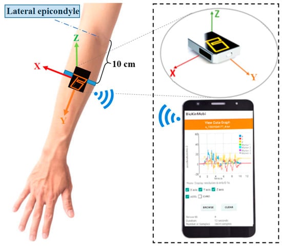 The IMU was calibrated prior to ROM testing according to the device instructions. The IMU was securely attached to the participant’s forearm with a self-adhering strap, 10 cm distal to the lateral epicondyle (see Figure 1). Measurements were sent wirelessly to a mobile phone and subsequently transferred to Biokin specific software to calculate ROM which was performed by a researcher (NN or PP) who was blind to goniometer measurements.