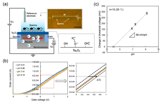 We used a n-channel depletion-mode FET (silicon) with a Ta2O5/SiO2 (100 nm/50 nm) layer as a gate insulator, which had a width (W) and length (L) of 340 and 10 μm, respectively (ISFETCOM Co., Ltd., Saitama, Japan), as shown in Figure 1a. To prevent leakage currents in a buffer solution, the Ta2O5 thin film was coated and used as a passivation layer on the gate. The gate voltage (VG)–drain current (ID) electrical characteristics were measured using a semiconductor parameter analyzer (B1500A, Agilent, Hachioji-shi, Japan). The change in VG in the VG–ID electrical characteristics was estimated as the shift in the threshold voltage (VT), which was evaluated at a constant ID of 1 mA and a constant of drain voltage (VD) of 2 V. The surface potential at the gate surface (Vout) was continuously monitored using a source follower circuit (Figure S1 in Supplementary Materials S1), with which the potential change at the interface between a gate insulator and an aqueous solution can be directly output at a constant ID (RadianceWare Inc., Saitama, Japan) when VD and ID were set to 2.5 V and 700 μA, respectively. pH standard buffer solutions (pH 4.01, 6.86, 7.41 and 9.18; Wako) were prepared as the measurement solutions for the analysis of pH sensitivity with the ISFET sensors and a culture medium was utilized for the measurement of sperm behaviors. An Ag/AgCl reference electrode with KCl solution (Wako) was connected to the measurement solution through a salt bridge.