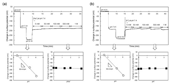 (a) Change in surface potential with varying pH and Na+ concentration using ISFET sensor. The gate surface potential at a pH of 4.01 was offset to 0 and the change in the potential was measured from a pH of 4.01 to 9.18 and then from a Na+ concentration of 5 mM to 1 M. (b) Change in surface potential with varying pH and K+ concentration using ISFET sensor. The gate surface potential at a pH of 4.01 was offset to 0 and the change in the potential was measured from a pH of 4.01 to 9.18 and then from a K+ concentration of 5 mM to 1 M.