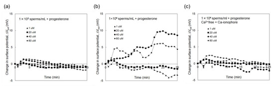 Change in surface potential of sperm-cultured gate ISFET sensor. Spermatozoa were added in the measurement medium at 0 h, which included progesterone at a concentration of 1–60 μM; (a) 1 × 105 sperm/mL, (b) 1 × 106 sperm/mL, (c) 1 × 106 sperm/mL in the Ca2+-free HTF medium containing Ca ionophore.