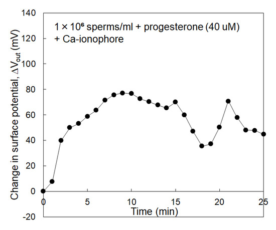 Change in surface potential of sperm-cultured gate ISFET sensor. A total of 1 × 106 /mL of spermatozoa were added to the measurement medium at 0 h, which included 40 μM of progesterone and 10 μM of Ca ionophore.