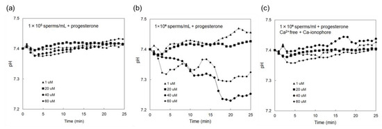 Change in pH of sperm-cultured gate ISFET sensor. Considering the pH sensitivity of the ISFET sensors (about 56 mV/pH on average) used in this study, the change in pH was calculated from the results plotted in Figure 3; (a) 1 × 105 sperm/mL, (b) 1 × 106 sperm/mL, (c) 1 × 106 sperm/mL in Ca2+-free HTF medium containing Ca ionophore.