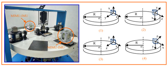 In the paper, the Y-axis and z-axis accelerometers are calibrated respectively by a high-speed turntable, high-low temperature box, centrifuge and other equipment. The parameters in the error model are calibrated one by one using the least square method. Figure 3 shows the calibration scheme for the four positions of the accelerometer.