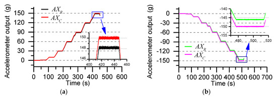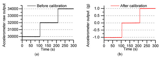 where is the raw output when the direction of the accelerometer’s sensitive axis is the same as the direction of gravity, represents the raw output when the accelerometer’s sensitive axis direction is perpendicular to the direction of gravity, , the parameter is determined by the data in Figure 4a. Figure 4b shows the calibrated accelerometer output under the gravitational field.