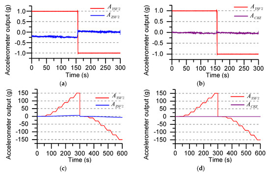 Cross-coupled error compensation of accelerometer: (a) Before calibration output of under the gravity field (±1 g); (b) After calibration output of under the gravity field (±1 g); (c) Before calibration output in the ±150 g acceleration range; (d) After calibration output in the ±150 g acceleration range.