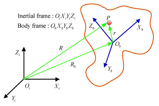 where g represents the Earth’s gravitational acceleration vector. It is worth noting that all the acceleration and the specific force vector mentioned here are relative to the inertial coordinate frame. For any point P on the projectile, the relation between the inertial frame and the body frame is shown in Figure 8.