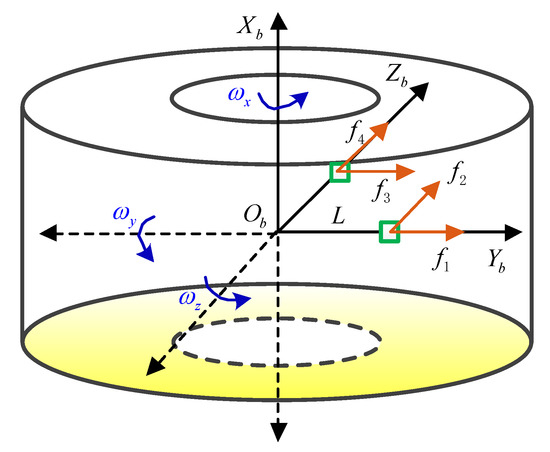 According to Equation (18), the measurement system only needs to output the angular velocity information related, except for the specific force of the centroid of the projectile. Based on the above analysis, the inertial measurement system obtains at least four inertia quantities in the vector V to calculate the three-axis acceleration and angular rate completely.