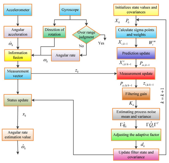The solution flow of angular rate base on AUKF (adaptive unscented Kalman filter) algorithm.