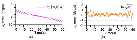 where represents the sampling time, represents the sampling period, and can be determined by linear interpolation based on the angular rates at time and time . The angular rate at the current time depends on the angular rate and the angular acceleration at the previous time and the angular acceleration at the current time. Since the output error of the accelerometer is transmitted to the angular acceleration, it is finally accumulated into the angular rate of the required calculation through the superposition operation. With increasing time, the angular rate error will be larger and larger, so the integration algorithm is not conducive to work of long duration. The error does not accumulate with time, but the angular rate sign cannot be judged. Therefore, using the effective initial value measured by the X-axis gyro to judge the angular rate sign, the expression can be written as:
