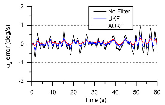 Angular rate error based on UKF and AUKF algorithm.