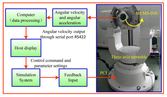 The developed MEMS IMU device is mounted to the center of the three-axis turntable through a clamp, and the turntable is controlled according to a given control command. The MEMS IMU processes the acquired angular rate and angular acceleration information through a computer, according to the angular rate calculating model and the AUKF algorithm for real-time estimation of rate of roll angle.