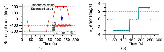 Figure 17a shows the variation of the roll angular rate estimated by the accelerometer data and the AUKF algorithm. By comparing with the theoretical value, it can be seen that when the turntable roll axis is operated at an angular rate of ±200°/s, the angular rate estimation error is ±3°/s or so. The error is mainly caused by the output error of the sensor itself. It can be clearly seen from Figure 17b that the static error and the dynamic error are stable in a certain interval and do not diverge with time.