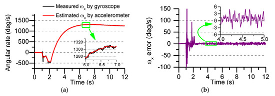 During the test, the MEMS IMU device was installed at the center of mass of the projectile and fastened with screws to prevent its longitudinal sliding and axial rotation, which was beneficial in reducing the measurement error of the gyro and accelerometer. After the launch, the data recorder is recovered and the flight process data is read. Figure 19a shows the roll angle rate of the rocket projectile measured by the gyro and the roll angle rate estimated using the accelerometer data and AUKF algorithm, Figure 19b shows the error between the measured value and the estimated value.