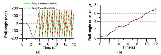 Roll angle calculated in real time and the error of roll angle in flight test: (a) The calculated roll angle uses the measured and estimated angular rate; (b) The error of roll angle.