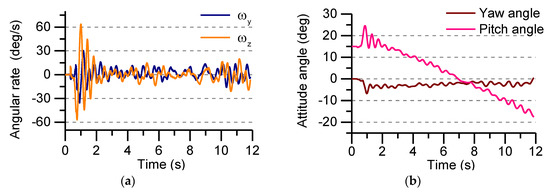 The Y-axis and z-axis angular rate and attitude angle in flight test: (a) The Y-axis and z-axis angular rate; (b) Yaw angle and Pitch angle.