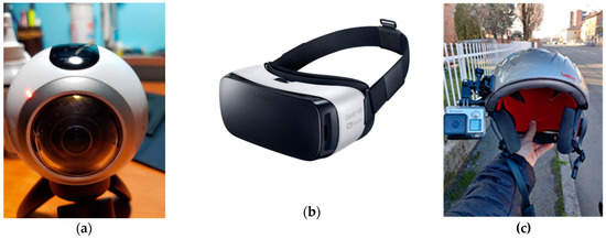Samsung gear 360 camera (a); Samsung Gear VR produced by Oculus (b) and GoPro Hero 4 attached to a helmet (c).