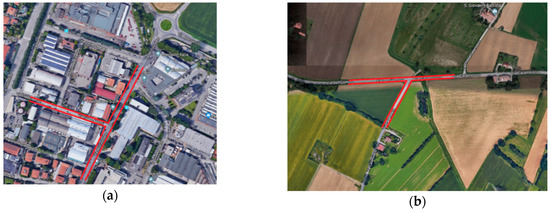 Intersections where the simulations took place, located in urban area (a) and in suburban area (b). (Coordinates 44°32′07.0″ N, 11°21′33.6″ E for urban intersection and 44°31′38.2″ N, 11°23′38.0″ E for suburban intersection).