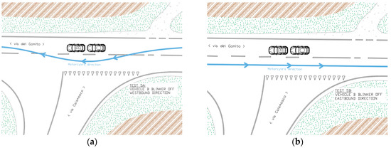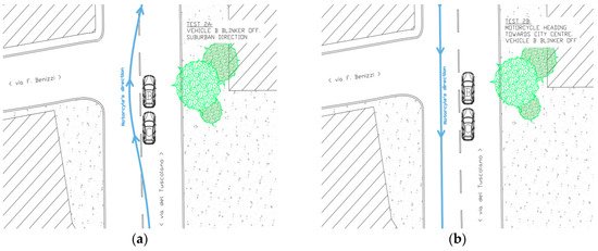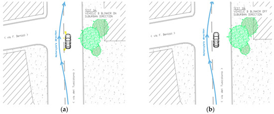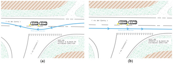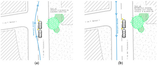 The simulations foreseen the use of three vehicles: a motorbike and two sedan cars. The motorbike was identified as “Vehicle A”. The cars, placed steady at the intersection of the two roads (see Figure 2), were identified as “Vehicle B” and “C”, respectively. The vehicle C assumed the role of vehicle occluding the view: it partially prevents the ability of the arriving motorcyclist to see the blinker of the vehicle B during the turning maneuvers. The first set of videos were shot through the camera attached on the motorcyclist helmet (vehicle A); contemporarily, videos inside the car stopped at the intersection were shot using the GoPro Hero mounted on the driver’s helmet.