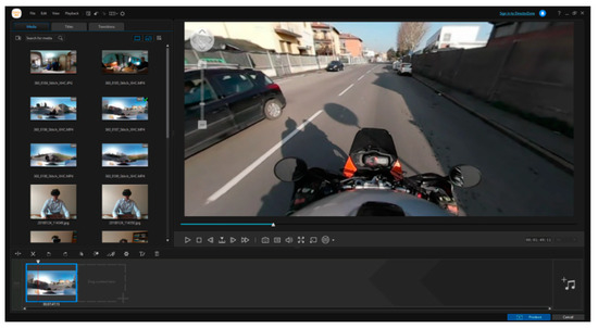 The videos collected from the 360-camera during the simulations have been edited and rendered in the ten videos representing the base for the tests. In order to do so, the editing software “action director” designed and developed by Samsung has been used. For each simulation, the images were treated with cutting and editing procedures (Figure 8), obtaining the final ten videos to be used for the survey phase.
