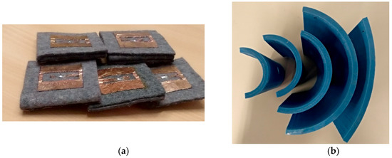 Figure 10a shows the different manufactured prototypes from hs = 2 mm to hs = 10 mm in steps of 2 mm. Antennas were stacked in different felt layers. For a better consistency, layers were glued using a solvent free glue stick. This technique was chosen to ensure the same dielectric properties for all the manufactured antennas, but it has probably also led to a kind of layered substrate instead of a strictly homogeneous one. A set of bending fixtures is shown in Figure 10b. They were built with a BQ Wibox2 three-dimensional (3D) printer [40]. Prototypes were measured using an E5071C Agilent Network Analyzer in a free space environment. Figure 10c represents the reflection coefficient measurement. The simulated and measured results for the different bending values are shown in Figure 11.