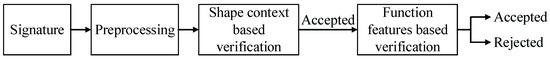 The diagram of the proposed method is shown in Figure 1. The input signature is first preprocessed for smoothing and normalization, and then it is fed into the shape context-based verification module, which does well in quickly distinguishing the random forgeries owing to their manifest differences in shape. Most obvious forgeries can be rule out in this stage. The signature passed through the first module is verified by function features-based verification module. This module achieves more accurate verification results due to the application of details in signature and decision fusion by interval-valued symbolic representation-based classifier.