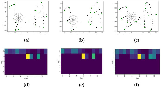 Examples of shape context feature extraction. (a) A reference signature of one user. (b) A corresponding genuine signature from the same user with reference one. (c) A skilled corresponding forgery from the same user with reference one. The green square points represent selected trend-transition-points. (d–f) Shape context histograms for chosen trend-transition-point in the signatures of (a–c), respectively.