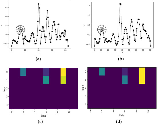 Under this circumstance, a function feature is considered to be a 1-D array and a 2-D shape. The problem of measuring the similarity of two function features can be translate into how similar these two shapes. Figure 4 shows the process of SC-DTW. Figure 4a,b are the time series of function feature v listed in Table 1 of two signatures from the same user. Figure 4c,d are the corresponding shape context histograms. That the shape context is similar means the sample points in time series are well matched. Please note that the application of shape contexts is only used to find the alignment between two time series. The measurable cumulative distance of them is still obtained by the original cost matrix for the convenience of following classification.