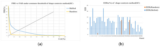 Results of shape context-based verification method (SC). (a) ROC curves under common threshold. (b) EER of each user under user threshold.