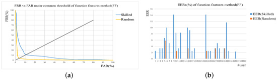 Results of function features-based verification method (FF). (a) ROC curves under common threshold. (b) EER of each user under user threshold.