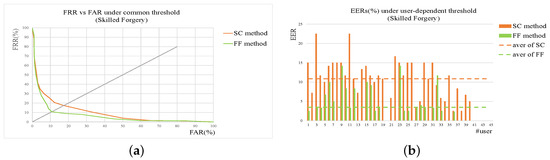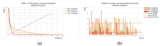 Results of SC, FF, and two-stage method on skilled forgery. (a) ROC under common threshold. (b) EER of each user under user threshold. In addition, those dotted lines are the average levels of corresponding methods.