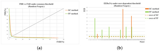 Results of SC and FF method on random forgery. (a) ROC under common threshold. (b) EER of each user under user threshold. In addition, those dotted lines are the average levels of corresponding methods.