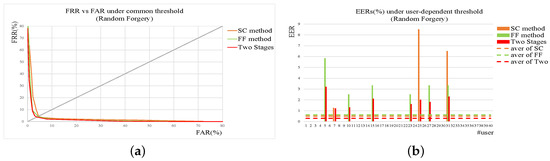 Results of SC, FF, and two-stage method on random forgery. (a) ROC under common threshold. (b) EER of each user under user threshold. In addition, those dotted lines are the average levels of corresponding methods.