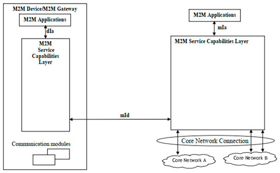 In recent years, under the impetus of organizations such as Internet Protocol for Smart Objects (IPSO) Alliance, resource-constrained intelligent goods and sensing nodes can access the internet through the IP protocol and become devices that can be directly addressed in the network space [18]. Based on the service-oriented design method, researchers have proposed a variety of software architecture reference models for building IoT systems. M2M was a standard IoT architecture being developed by the European Telecommunications Standards Institute (ETSI) on the communication between machines and machines, which was designed for non-intelligent terminal devices to communicate with other intelligent terminal devices or systems through the mobile communication network. The functional architecture of M2M is shown in Figure 2: the M2M service capability layer (SCL) was deployed in devices, gateways and network domains with storage modules; the applications in devices and gateways accessed SCL through the dIa interface; the applications in the network domain accessed SCL through the mIa interface; the device or gateway interacted with the SCL in the network domain by the mId interface [19].