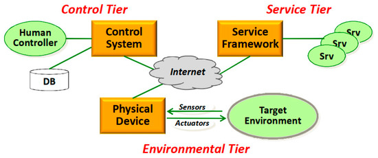 The 3-Tiers architecture combined the back-end cloud service with the front-end physical entity service and proposed a 3-layer information physical fusion system software architecture consisting of the environment layer, the service layer and the control layer. As shown in Figure 3, the physical components in the environment layer were services provided by the perceptron and the executor. The cloud service components in the service layer were services provided by platforms such as traditional cloud computing. As well, the following functions were implemented in the control layer: monitoring physical components and services, ensuring dynamic composability, ensuring service adaptability; and ensuring autonomous Cyber-Physical System management [20]. This architecture provides services for collecting physical data and interacting with the physical world. However, these services do not constitute an independent executable IoT systembut needto be called by the user or combined with the cloud service to complete the execution of related tasks.