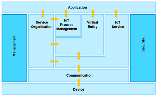 IoT-A was an IoT software architecture that implemented horizontal interconnection and interoperability between local IoT systems supported by the EU’s 7th Framework Project. Its reference model is shown in Figure 4. The local object association system with different sensing and communication technologies was abstracted into an IoT resource model that provides unified services and the components were divided into several components according to their roles, function granularity and abstraction level, including device component, communication component, service organisation component, IoT process management component, virtual entity component, IoT services component, security component and management component [21]. and. The IoT-A architecture establishes virtual entity services on the resource model and provides a higher level of abstract interface for the construction of the IoT application system through various modules. The IoT-A architecture has high flexibility and wide applicability as it meets application needs in the form of business processes.