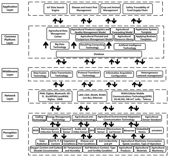 - Application layer: The application layer is the highest level of the architecture and the place where IoT’s value and utility are most apparent. There are lots of intelligent platforms or systems in this layer for the environmental monitoring and control of plants and animals, the early warning and management of diseases and insect pests, and agricultural product safety traceability, which can improve production efficiency as well as save time and cost.