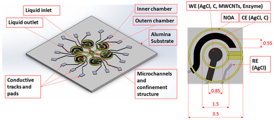 The schematic representation of the designed microfluidic sensor platform is reported in Fig. 1; each layer and material used in the development of the platform is indicated. Alumina is the selected substrate material due to its mechanical properties, good adhesion because of its porosity, and ease of handling. We purchased the substrates in 22 × 22 mm squares. The platform is composed of six electrochemical cells with a diameter of 3.5 mm, each of them characterized by three electrodes; WE is designed in AutoCAD with 0.85 mm diameter; the nominal distance between WE and CE is 0.55 mm. A UV-cured material to manage liquid samples surrounds the whole structure. The yellow central structure in Figure 1 permits the delivery of the sample on WEs by introducing a micropipette in the inlet and injecting. The six bigger chambers serve to contain the buffer solution. We design microfluidics to contain 20 μL of sample fluid including the amount that remains in the channels and inlet. Inner chambers have a diameter of 1.5 mm and the channel length is 2.8 mm. The CAD geometry of the channel is an isosceles triangle with base angle of 50° and base length equal to 300 μm. The central inlet nominal diameter is about 1.1 mm and it is dimensioned with interference on a 1.1 mm tip micropipette.
