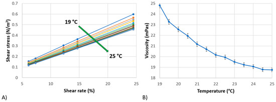 (A) Shear stress vs Shear rate, showing a complete linear behavior for temperature in the range 19–25 °C for AgCl ink; (B) Viscosity as a function of temperature for AgCl ink.