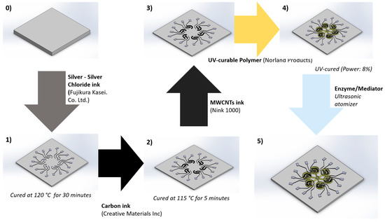 AJ300 system commercialized by Optomec was used to fabricate and functionalize the electrochemical sensors platform with microfluidics. Table 1 summarizes the AJP process parameters for each ink and Figure 3 shows the process scheme.